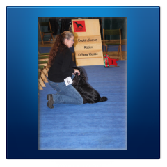Schwarz, 3 Jahre, geschlechtstypisch geprägt mit entsprechendem Kopf und Ausdruck ein großrahmiger Typ mit kräftigen Knochen, schräg gestellter Schulter, kräfitgen Kniegelenken, Haarkleid dürfte eine Idee glatter sein, der ruhige freundliche Hund zunehmend kraftvolle Bewegungen, stabilisiert sich in der Oberlinie und kommt in einen korrekten Stand. Ein vorzüglicher Typ